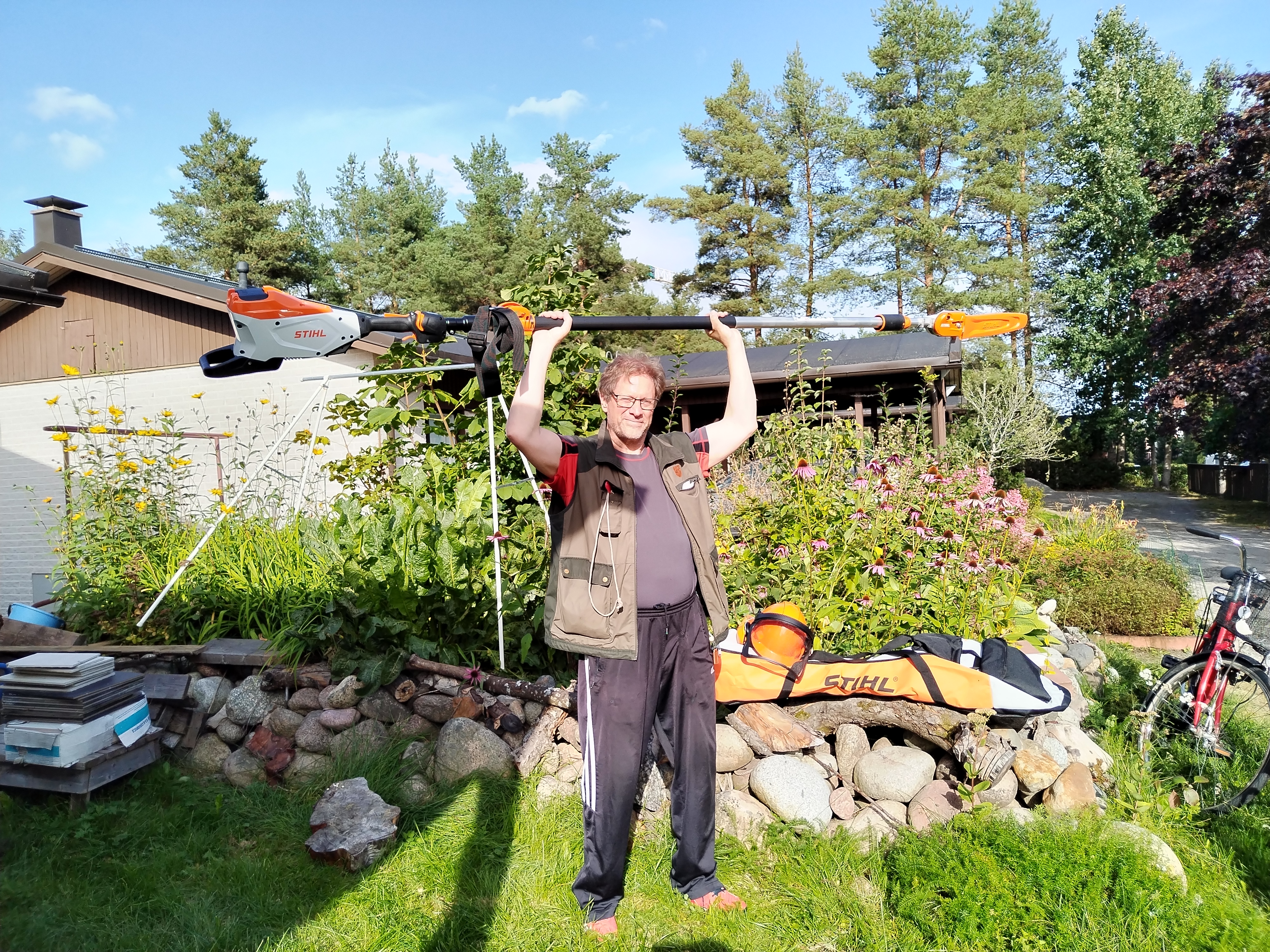 Käytettävissäni sekä bensa-, että akkukäyttöiset Stihl HT135 teleskooppisahat 390cm mittaisina. Kuvissa alla molemmat mainitut. Kuten näette ulottuvuutta riittää: